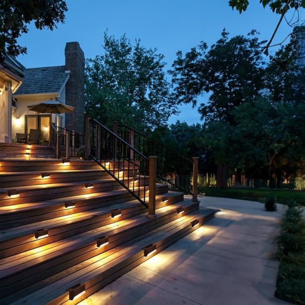Sechs Lampen liefern angenehmes Licht für Terrasse und Weg.