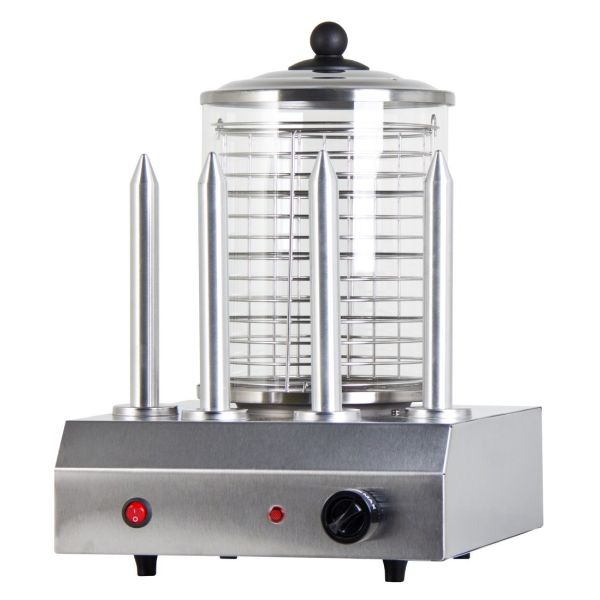 Les 4 piques en acier chromé maintiennent fermement les saucisses pendant la cuisson, assurant une répartition uniforme de la chaleur. Le cylindre en verre de 200 x 250 mm vous permet de garder les pains au chaud et moelleux jusqu'au service.