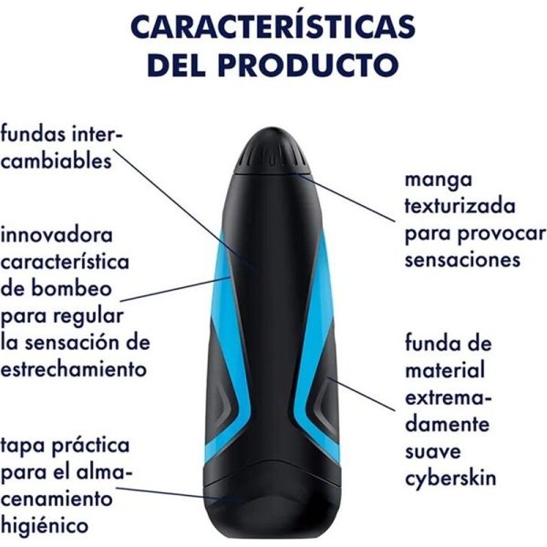 Le produit présente un design sportif moderne en noir et bleu, évoquant la robustesse et le dynamisme. Le boîtier extérieur est fabriqué en ABS rigide, assurant la structure et la durabilité, tandis que le manchon interne est composé de Cyberskin ou d'un matériau peau douce, très souple, pour un ressenti proche du contact réel. Ce mélange permet de concilier solidité extérieure et plaisir intérieur sensoriel élevé.