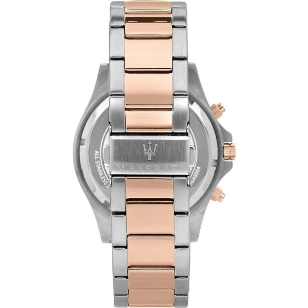 Montre chronographe pour homme Maserati de la collection Challenge. Modèle en acier, Pvd or rose. Horloge avec boîtier en acier satiné de la taille de 44 mm. Bracelet en acier, couleur or rose en métal avec boucle de plongée avec verrou de sécurité.