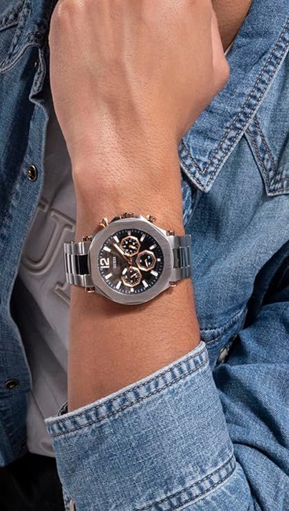 Affirmez votre style avec la montre Guess GW0539G1, une pièce masculine au design affirmé qui allie élégance urbaine et performance. Conçue en acier inoxydable avec des finitions bicolores argent et or rose, elle se distingue par son cadran bleu profond aux détails raffinés.