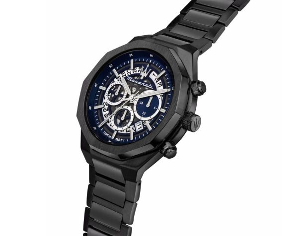 Dotée d'un boîtier en acier avec revêtement PVD noir et d'un cadran squelette bleu, la Stile Watch met en avant une allure résolument moderne. Son bezel hexagonal et son bracelet en acier renforcent son aspect robuste et sophistiqué, tandis que la finition soignée reflète l'exigence et le savoir-faire de Maserati.