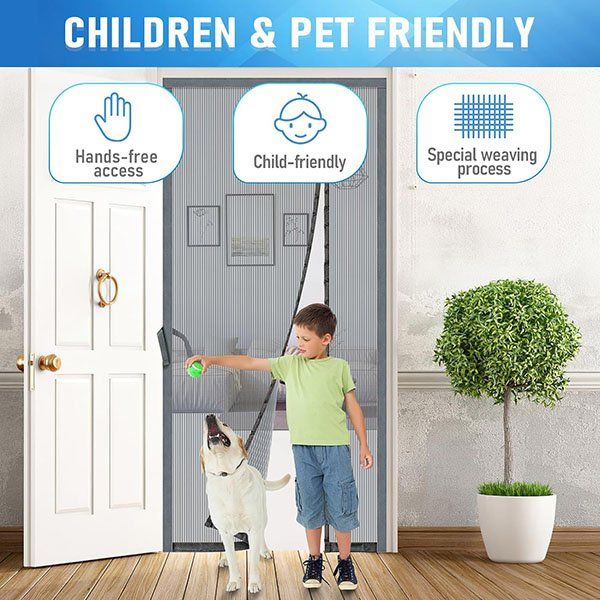 Le rideau magnétique anti-insectes est très facile à utiliser. Vous pouvez l'ouvrir facilement et il se referme automatiquement grâce à des aimants situés sur les bords du rideau, qui rendent possible une fermeture magnétique. Même si vous avez les mains occupées, vous pourrez l'ouvrir sans effort. Vos animaux de compagnie pourront aussi traverser le rideau anti-insectes.