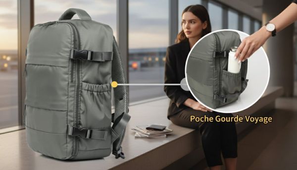 Poche Latérale Extensible pour Gourde/Bouteille : Gardez votre hydratation à portée de main sans encombrer l'intérieur du sac.