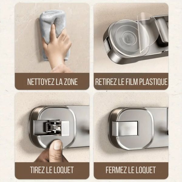 Grâce à son système adhésif puissant sans vis ni perçage, il s'installe facilement sur des surfaces lisses (carrelage, verre, métal, surfaces vernies).