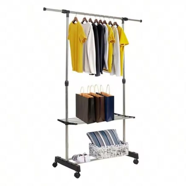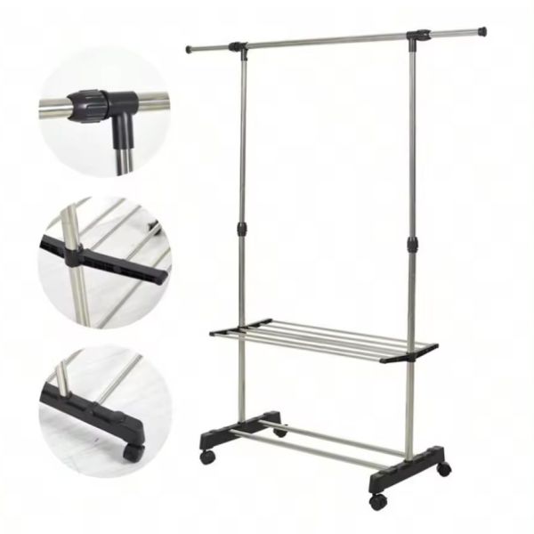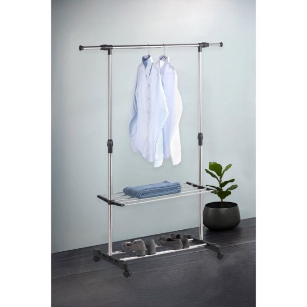 Équipé de quatre roulettes pivotantes, ce porte-manteau se déplace d'une pièce à l'autre en toute fluidité. L'étagère centrale supporte vos accessoires ou piles de linge, tandis que la barre inférieure accueille vos chaussures, bottines ou paniers de rangement.