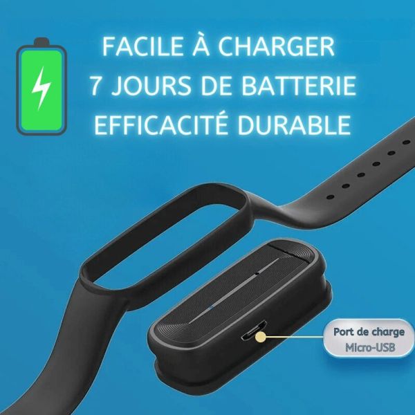 Ce bracelet utilise des ondes sonores à haute fréquence pour repousser les moustiques et autres parasites, offrant une protection efficace et sans substances chimiques.
