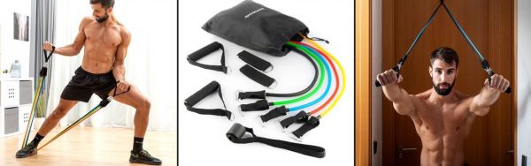 Ce set de 5 bandes de résistance ajustables de plusieurs couleurs (selon niveau d'intensité) inclut : un guide d'entraînement, un sac de transport et des accessoires pour réaliser une multitude d'exercices pour les bras, les épaules, la poitrine, le fessier, les jambes, ...