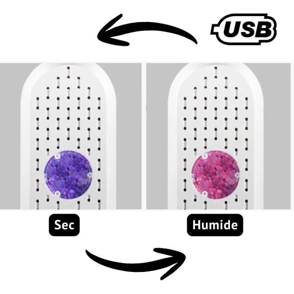 Lorsque l'indicateur devient violet, branchez MiniDry™ en USB pour évacuer l'humidité et le rendre prêt à l'emploi à nouveau.