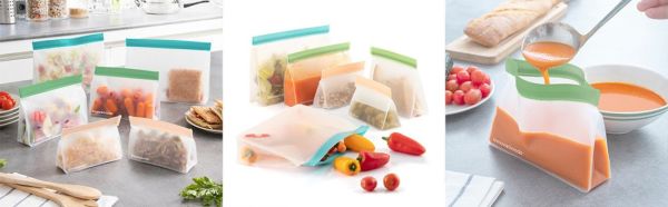Un set de 6 sacs réutilisables avec fermeture hermétique pour transporter des aliments ou les conserver au réfrigérateur ou au congélateur (même les liquides).
