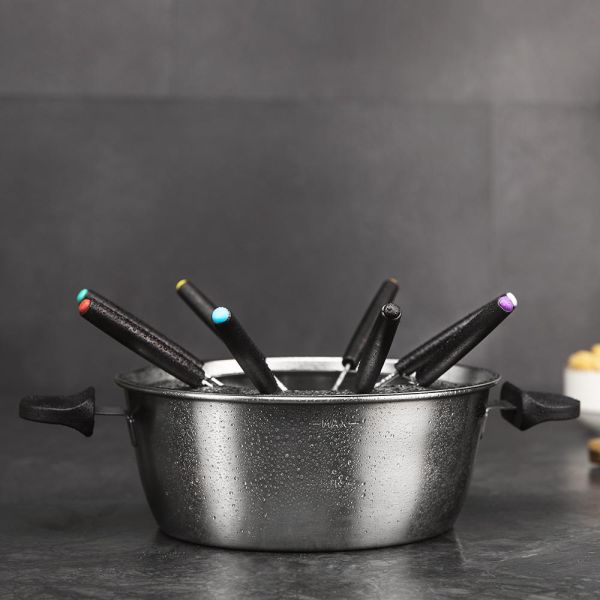 Avec sa grande capacité, ce set de fondue permet à jusqu'à 8 personnes de savourer le plaisir d'une fondue en même temps. Que ce soit pour une raclette-party version fondue ou un dessert gourmand, chacun dispose de sa propre fourchette avec embout coloré pour éviter toute confusion.