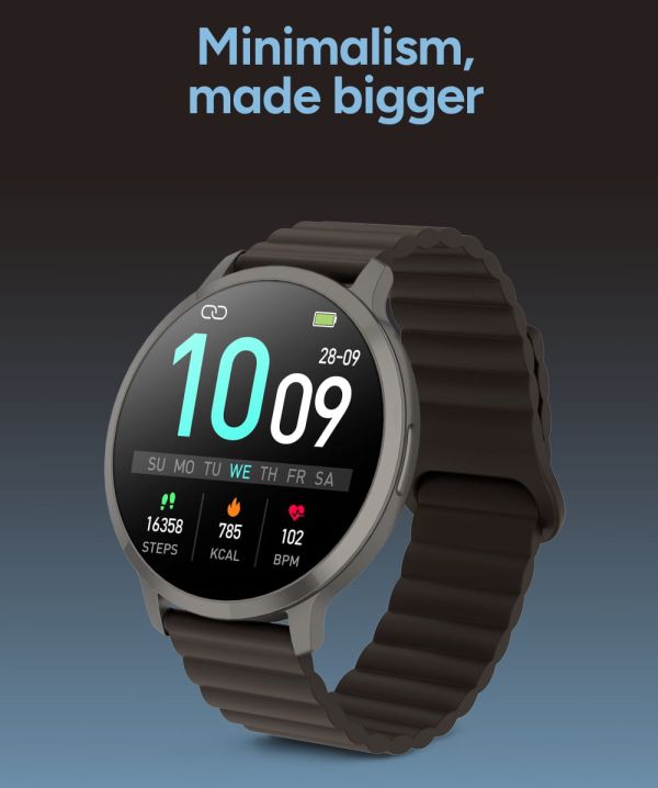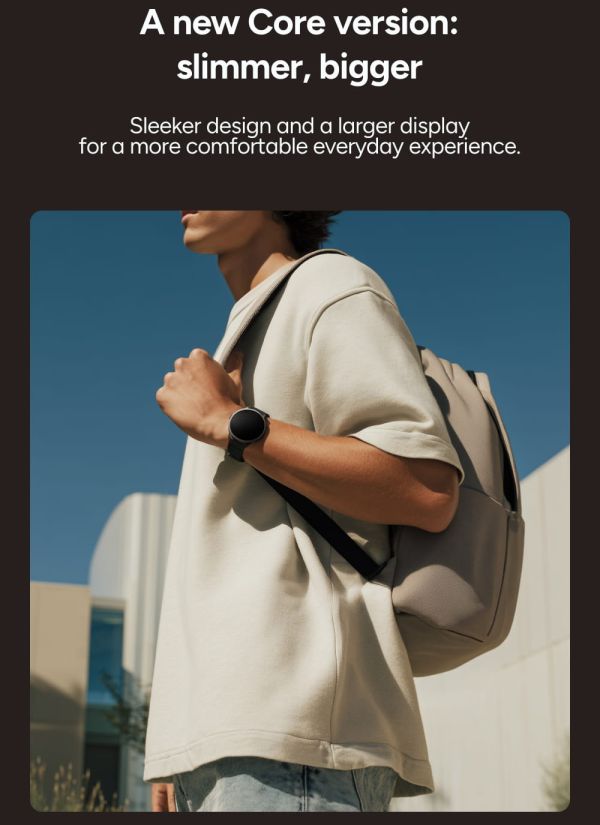 Malgré son grand écran, la Core Max conserve un profil fin et léger qui assure un confort immédiat dès les premières secondes. Son boîtier en alliage de zinc apporte robustesse et qualité perçue, tandis que la conception intégrée de la lunette et de l'écran renforce son aspect moderne. Le bracelet magnétique en silicone permet un ajustement rapide et précis, offrant un maintien optimal tout au long de la journée. Chaque détail est pensé pour allier praticité et élégance.