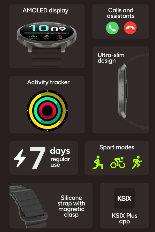 Avec la Core Max, votre poignet devient un véritable centre de contrôle. Vous pouvez passer et recevoir des appels, consulter vos notifications d'applications comme WhatsApp ou Instagram, et interagir avec les assistants de votre smartphone. Compatible avec Android® et iOS®, elle se connecte facilement via l'application KSIX Plus, vous permettant de synchroniser vos données avec des plateformes comme Apple Health ou Google Health. Une utilisation intuitive qui simplifie votre quotidien.