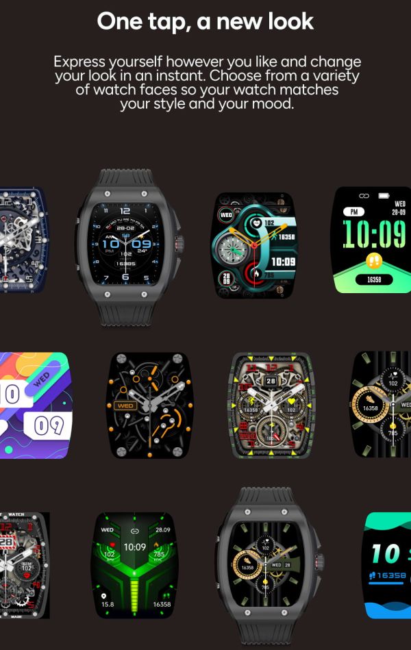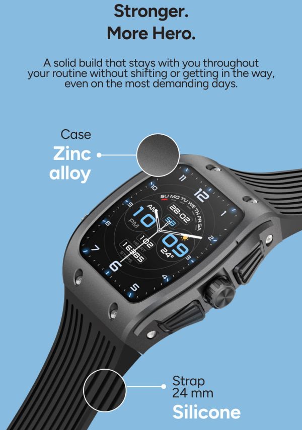 Avec son boîtier en alliage de zinc et son format imposant, la Hero affirme clairement sa personnalité. Son écran ovale incurvé attire immédiatement l'attention, tandis que ses boutons latéraux larges assurent une utilisation facile, même en mouvement. Le bracelet en silicone épais garantit un maintien sûr et confortable, idéal pour les activités sportives comme pour une utilisation prolongée. Chaque élément de son design a été pensé pour combiner résistance, ergonomie et style moderne.