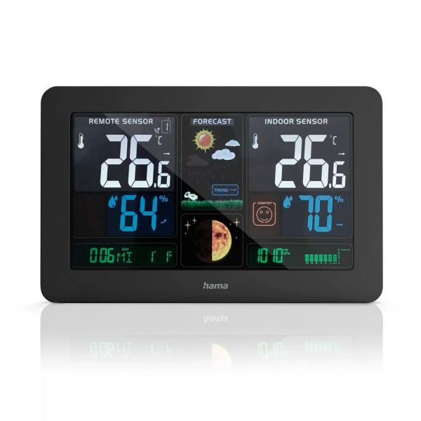 La Station météo premium avec écran couleur LED allie design moderne et technologie avancée pour offrir une lecture claire et intuitive de toutes les données météorologiques essentielles. Grâce à son écran couleur rétroéclairé, elle affiche en un coup d'œil les températures intérieure et extérieure, l'humidité de l'air, la pression atmosphérique, les phases lunaires et les prévisions météo sous forme de symboles animés. Son affichage lumineux et contrasté garantit une lisibilité optimale, de jour comme de nuit.