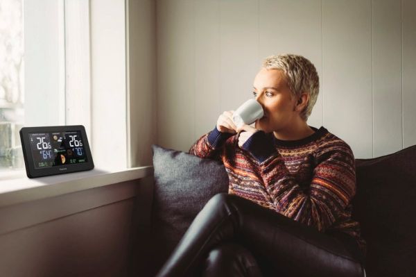 La station est accompagnée d'un capteur extérieur sans fil mesurant la température et l'humidité de l'air. Les données sont transmises automatiquement à la base principale, qui affiche simultanément les valeurs intérieures et extérieures. L'écran montre également les indicateurs de confort (de très triste à très joyeux), pour savoir instantanément si votre environnement intérieur est optimal. Une alarme de gel se déclenche entre -1 °C et +3 °C afin de prévenir tout risque de verglas et de dégivrage matinal.
