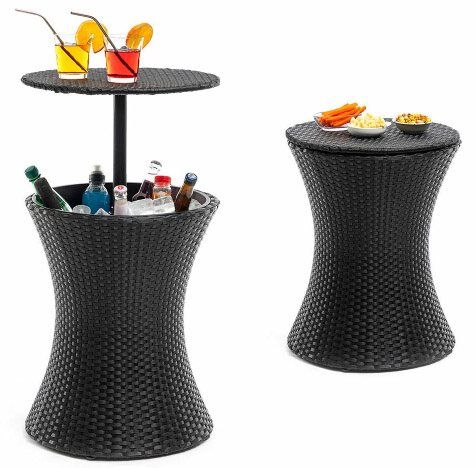 Parfaite pour mes garden‑parties : on pose les boissons sur la surface et elles restent fraîches grâce au seau intégré. J'aime bien le fait de pouvoir régler la hauteur — table cocktail ou table basse selon les besoins. Se vide facilement grâce au bouchon et le design imitation rotin est joli sur la terrasse.