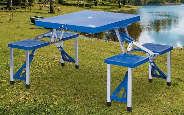Sehr praktischer Tisch für Campingausflüge. Lässt sich leicht auf- und abbauen und nimmt wenig Platz im Auto ein. Die Hocker sind stabil und bequem.